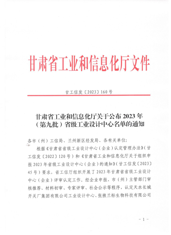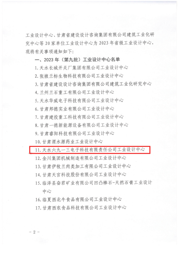 7410026月27日,甘肅省工業(yè)和信息化廳公布2023年(第九批)省級(jí)工業(yè)設(shè)計(jì)中心名單,經(jīng)省工信廳組織評(píng)審、公示,天水六九一三電子科技有限責(zé)任公司工業(yè)設(shè)計(jì)中心被認(rèn)定為2023年省級(jí)工業(yè)設(shè)計(jì)中心。